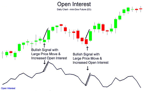 The chart below of the Dow Jones Industrial Average mini-Dow futures contract illustrates two examples of price increases with corresponding increases in open interest: